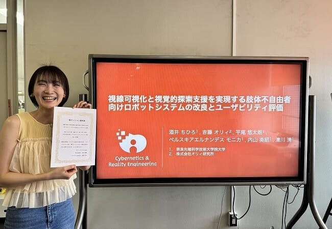 一般セッションの優秀賞を獲得することができ、大変光栄です。イベントへの招待やアドバイスを行ってくださった吉藤オリィ様、執筆や研究へのアドバイスをくださったサイバネティクス・リアリティ工学研究室の先生方に感謝申し上げます。今後さらに進展を目指していきたいと思います。