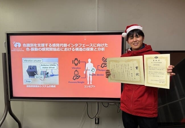 長岡さんが発表した研究「色識別を支援する感覚代替インタフェースに向けた色-振動の感覚間協応における構造の探索と分析」は、色覚異常者の色識別支援デバイス開発を最終目的とし,異なる感覚情報間に生じる無意識かつ自然な結びつきとして知られる「感覚間協応」を色と振動において調査した結果についてまとめたものです。本研究の社会的意義や独創性が評価され、本研究会からはWIT学生研究奨励賞を授与されました。 さらに、本研究は電子情報通信学会 ヒューマンコミュニケーショングループ(HCG)よりヒューマンコミュニケーション賞(HC賞)も受賞しました。 HC賞は、電子情報通信学会(IEICE)のヒューマンコミュニケーショングループ(HCG)が授与する賞の中でも最も権威の高い賞で、HCG 傘下の4つの研究会(HCS, HIP, MVE, WIT)で過去1年間に発表されたすべての技術研究報告の中から、おおむね50件あたり1件を目安に選出されます。 今回の受賞を契機に、今後さらなる研究の進展と実社会への応用が期待されます。